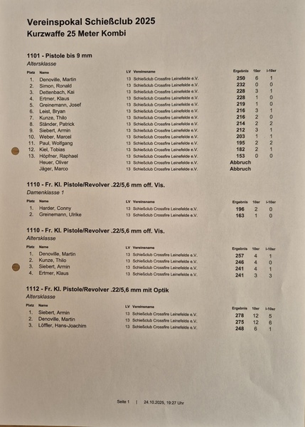 Ergebnisse  Vereinspokal 100m-Gewehr vom 18.10.2025 in Brehme unter "Stand Brehme" verfügbar